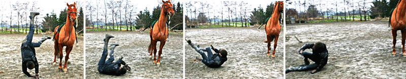 På billederne ses Palle Flodgaard, der underviser i faldteknik, han viser hvordan han falder af hesten uden at slå sig ved at bruge et rullefald.